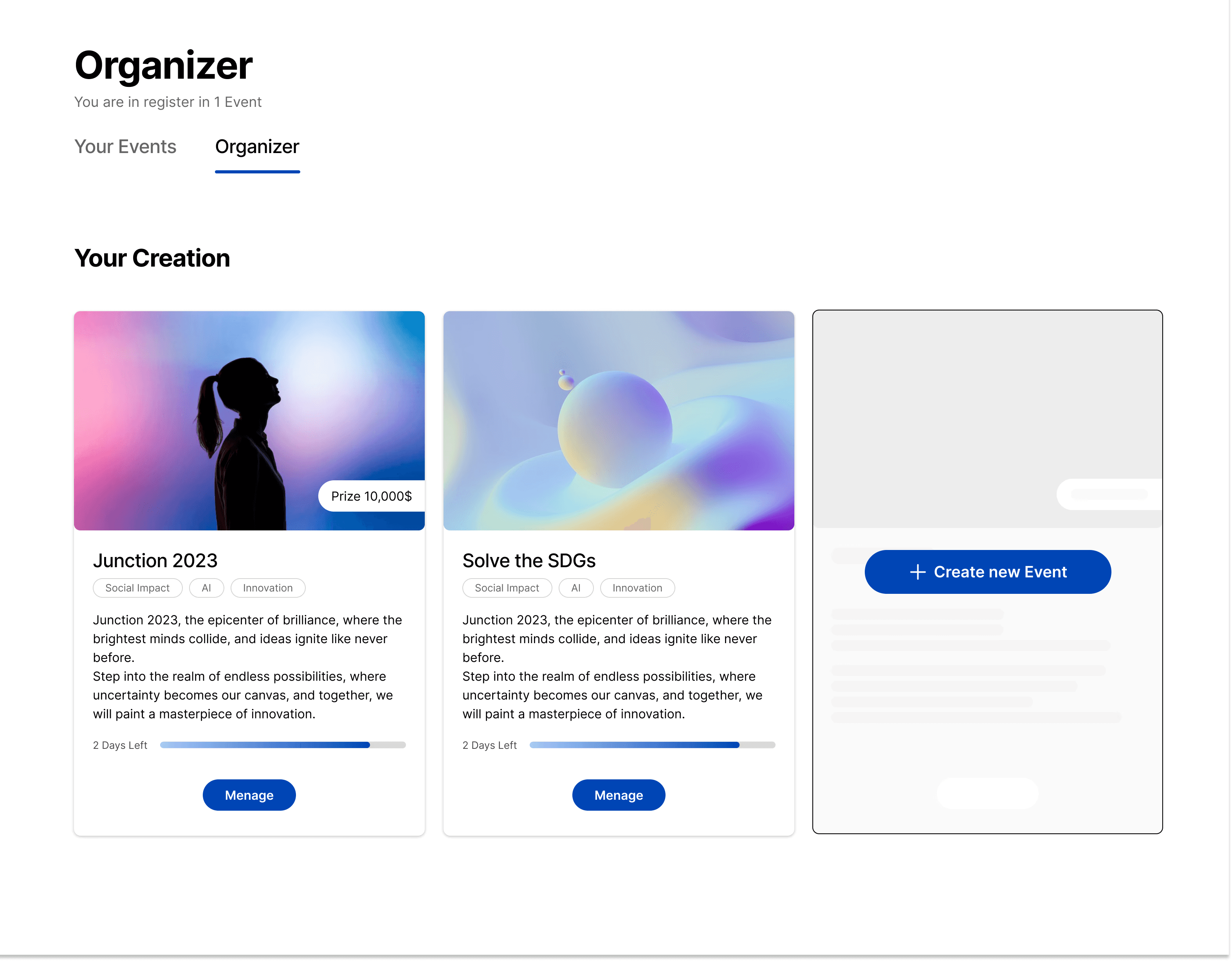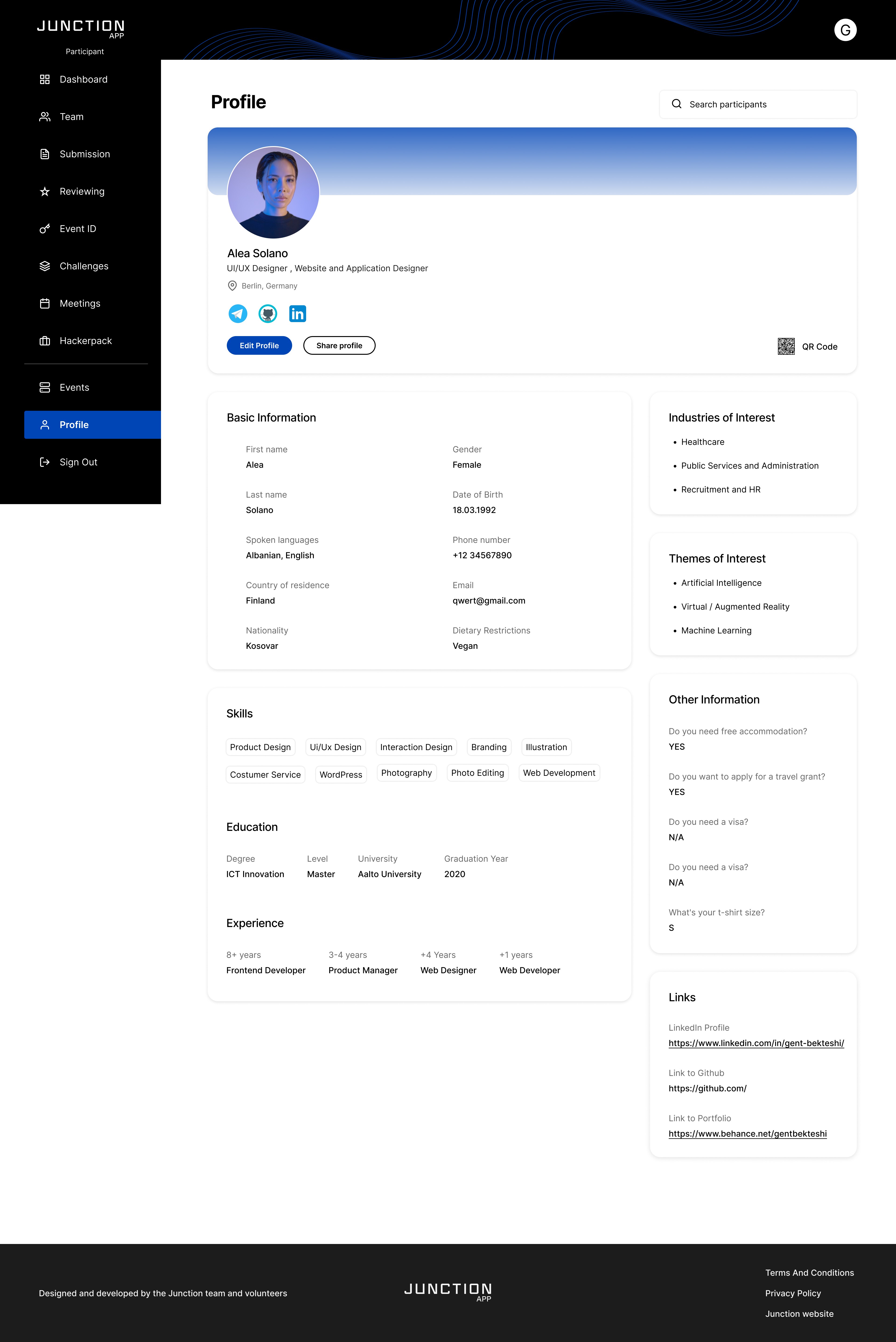 As Lead UI/UX Designer at Junction, I was responsible for shaping the digital experience across event platforms, participant dashboards, and partner-facing tools. I led the redesign of core user journeys, developed scalable design systems, and ensured visual consistency across platforms. I worked closely with developers to deliver intuitive and engaging interfaces that supported thousands of users. My focus was on usability, accessibility, and aligning design decisions with both user needs and organizational goals.